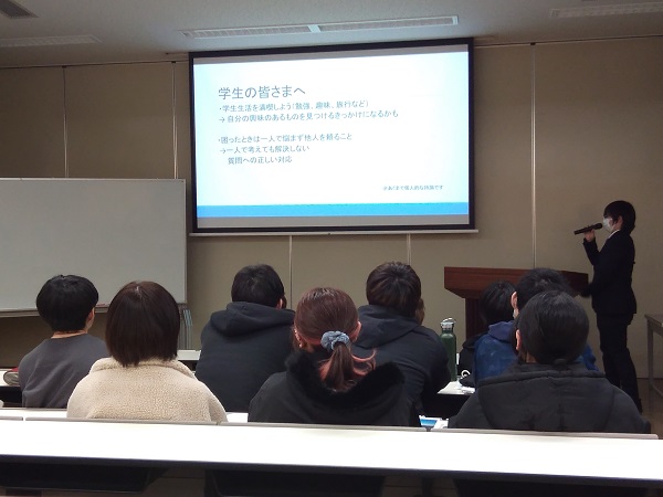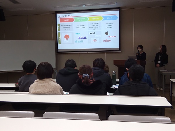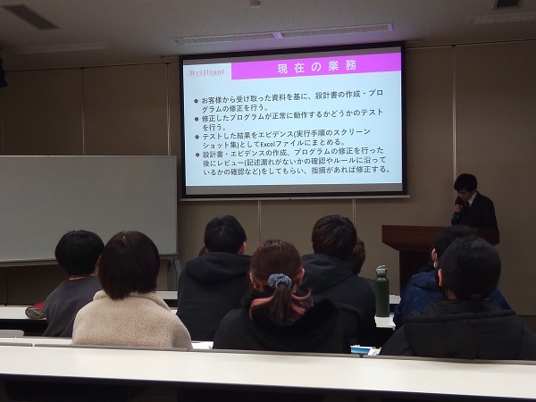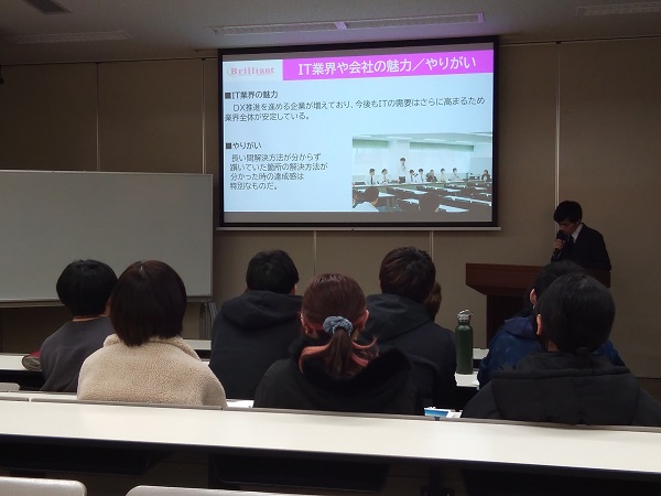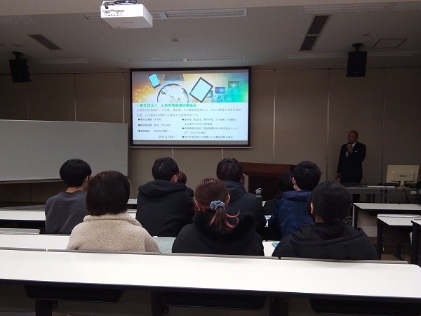 まずは、山梨県内のICT企業の業務の紹介から、ICT企業を取り巻く環境、学生に期待することなどの説明からスタート。