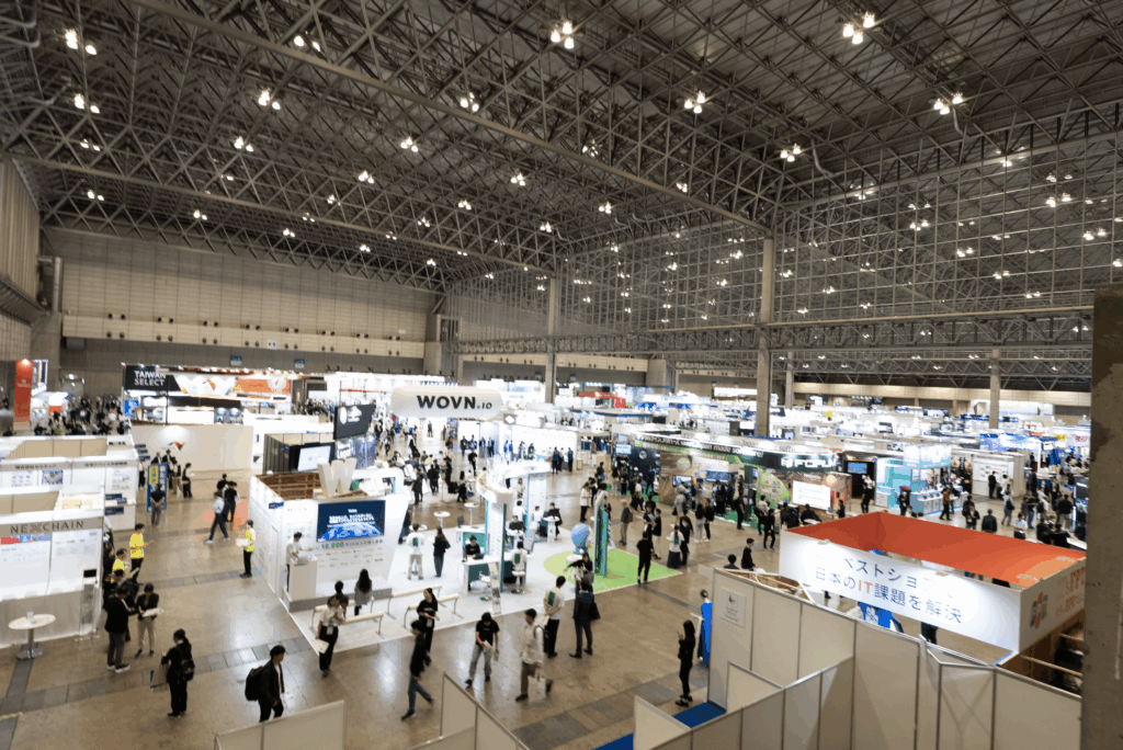 会場に入ると写真のように、広い会場に所狭しと企業や学校のブースがひしめき合っています。