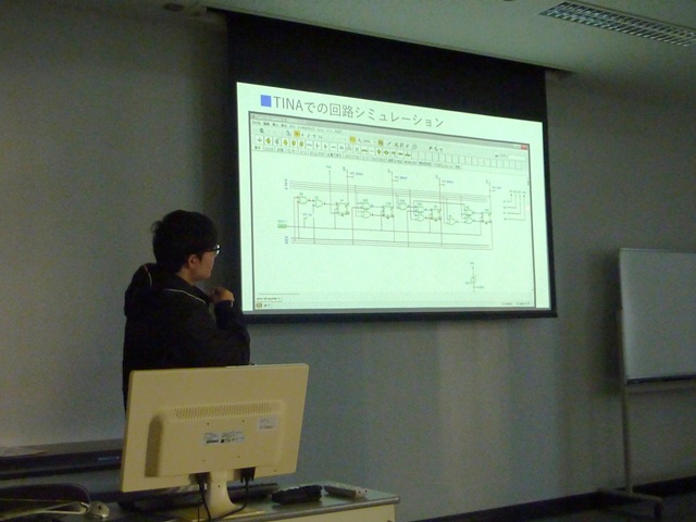 電子回路だけで動くデジタル時計の回路設計と回路製作に取り組んでいます。設計したデジタル時計がどのように動くのか、製作中に起きたトラブルとその解説方法など、詳しく説明してくれました。