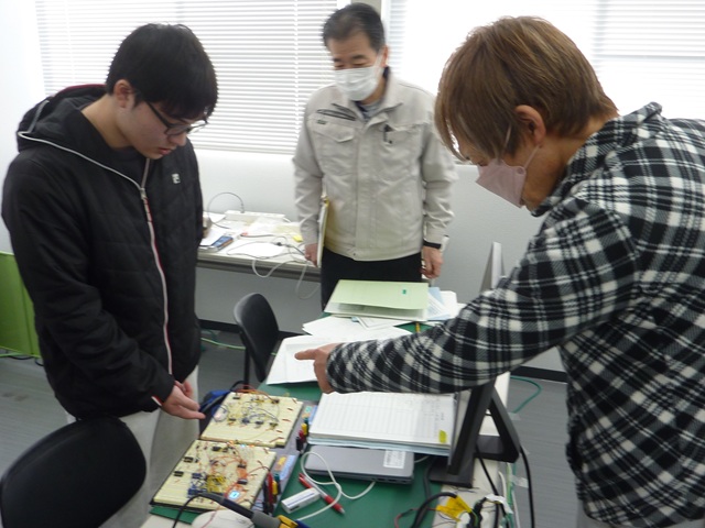 発表会の後は実験室に移動して、これまでに製作した回路のデモンストレーションを行いました。実際に回路が仕様どおりに動く様子を見せながら説明すると、ここでも活発な質問が飛び交いました。目の前で動く回路を見ながらの議論は、理解をより深める貴重な時間となりました。