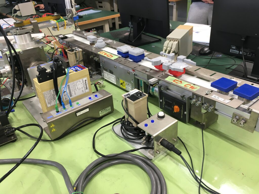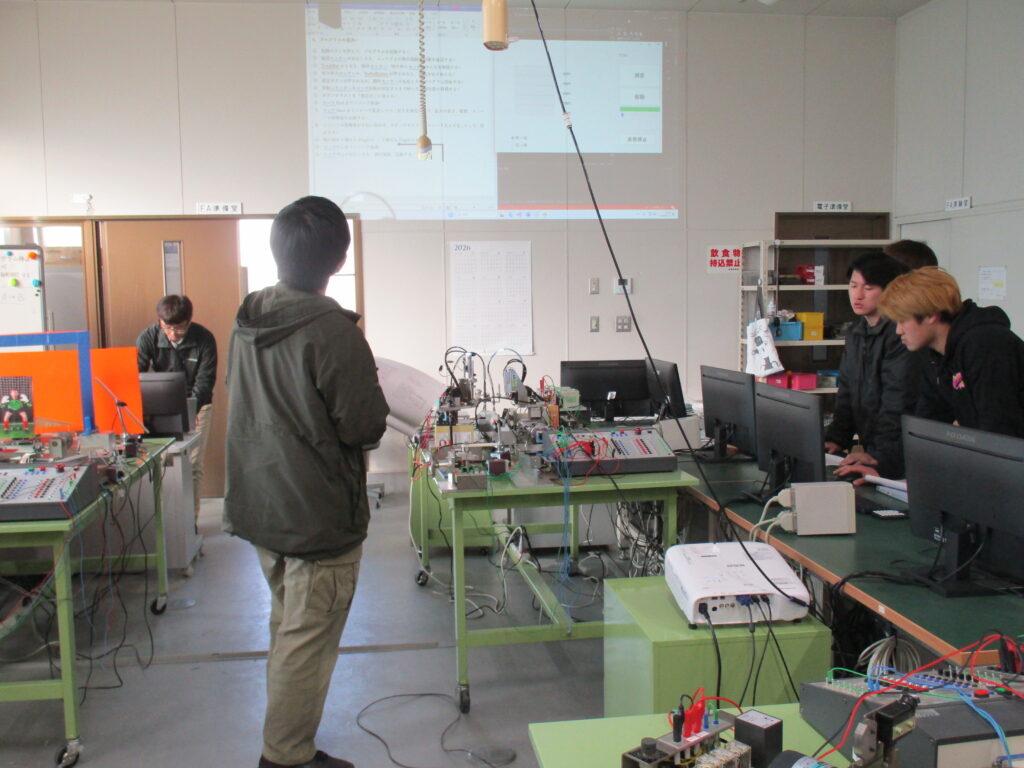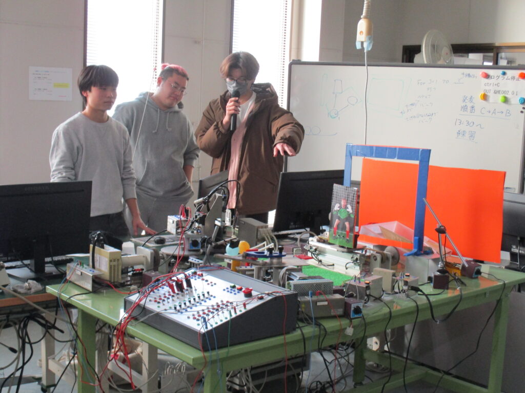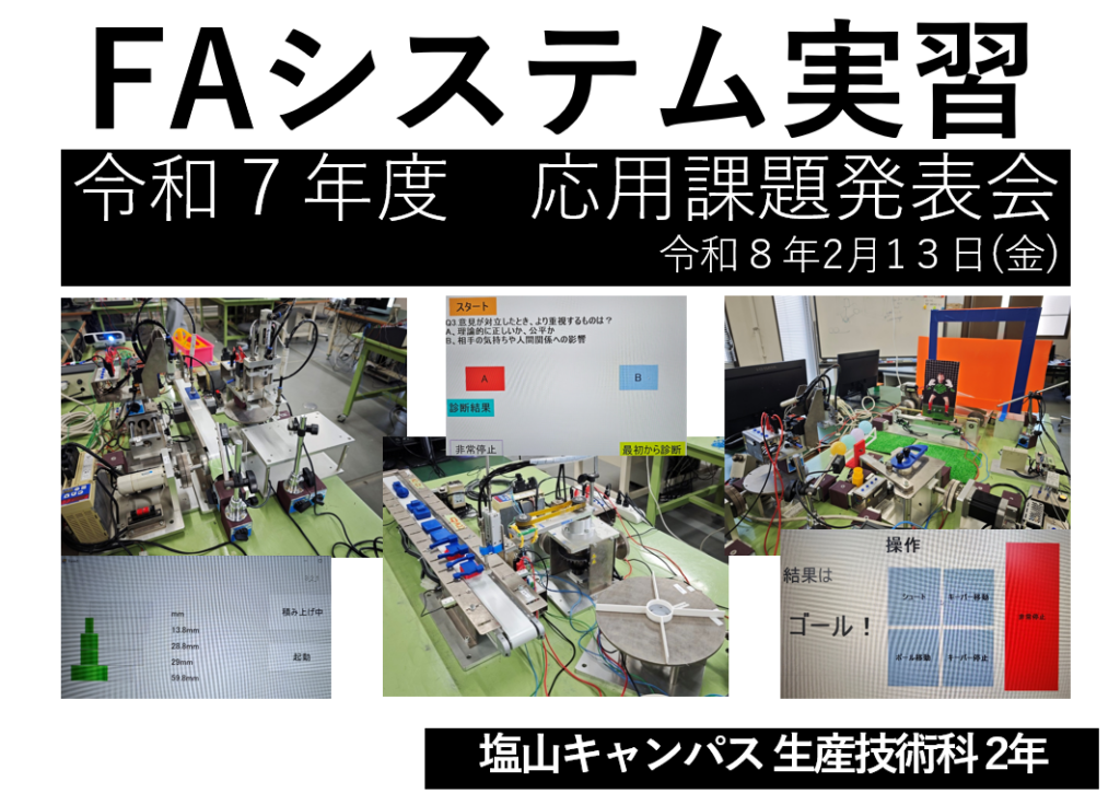 2月13日(金)に、FAシステム実習で構築した独自システムの発表会を実施しました。FAとは「ファクトリーオートメーション(Factory Automation)」の略で、工場の自動化を指します。一般的には、製造や組立などの生産ラインを自動化するシステムを意味しますが、本実習ではそれにとどまらず、自動化機器を制御する技術を活用し、各班がテーマに沿った自由度の高いシステムを構築することを目標としています。
