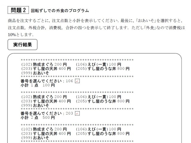 今回の問題2では、「回転ずしでの外食」を題材に、注文からお会計までを行うプログラムを設計します。