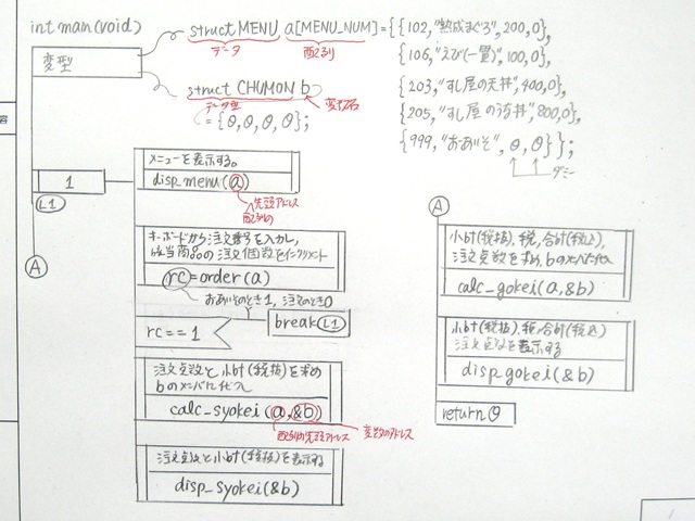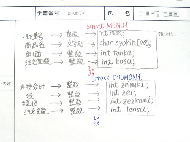 メニューを管理する MENU構造体 と、会計を管理する CHUMON構造体 を作成しました。