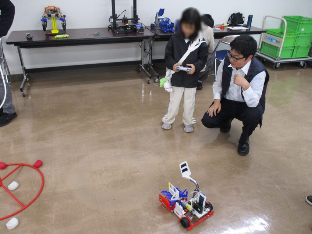学科の紹介ブースでは、「ロボコンやまなし」の球入れロボット競技に出場した歴代のマシンと、4足歩行ロボットの操縦体験を実施しました。子どもから大人まで多くの来場者に楽しんでいただき、本科の活動内容やモノづくりの魅力を伝える良い機会となりました。