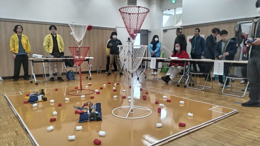生産技術科塩山キャンパスチーム(以下 生産技術科チーム)が出場した、自由参加の部 対戦型球入れロボット競技は、上下2段に分かれたかごに、赤白それぞれの球を入れることで、得点となる対戦競技です。今年から上のかごに球が入ると得点が2点になるルール改定がなされ、上のかごにいかにたくさんの球を入れるかが焦点となりました。この競技には6台のロボットがエントリーし熱戦が繰り広げられました。