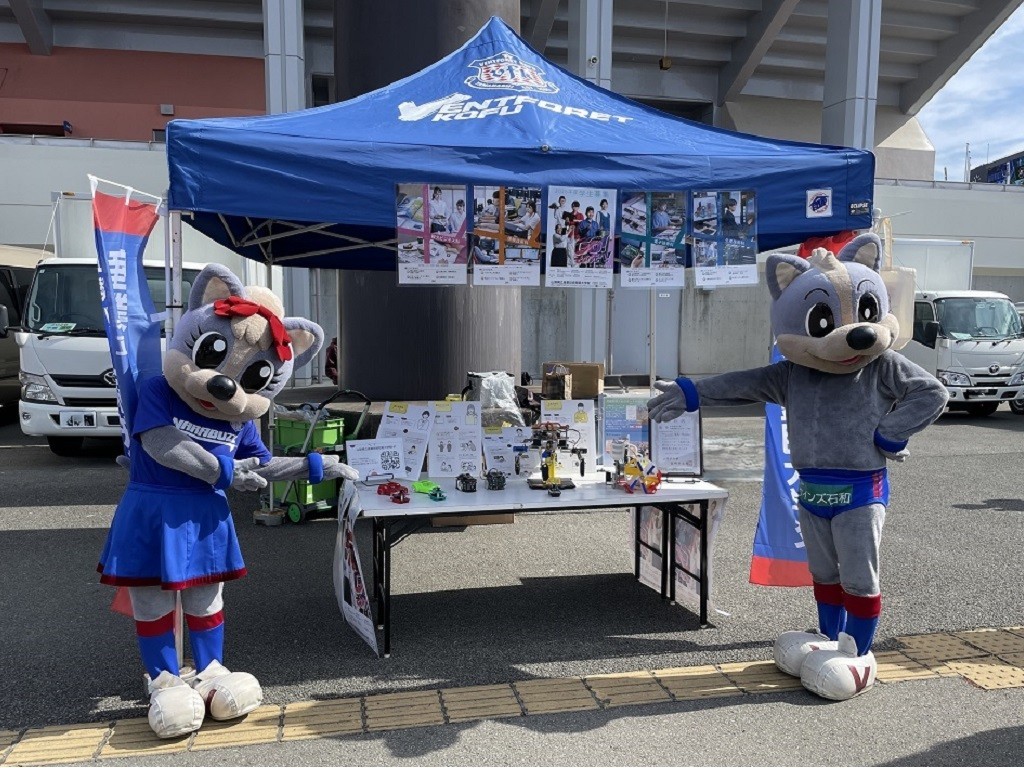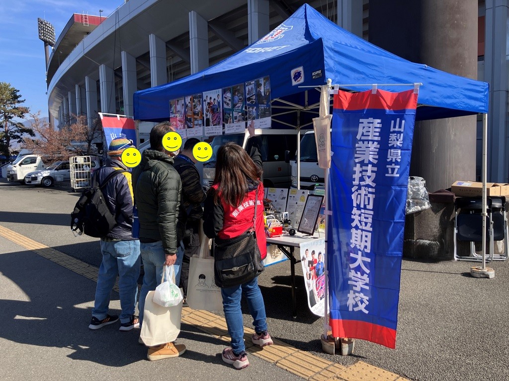 令和8年2月14日(土)、ヴァンフォーレ甲府はAC長野パルセイロとJITリサイクルインクスタジアムにおいて対戦しました。このゲームが始まる前の時間に、当校を紹介するブースを出展しました。ブースでは、学校で製作したロボットや各科を紹介するパネルを設置し、3月に行われる一般入学試験(再募集)の案内チラシを配付しました。