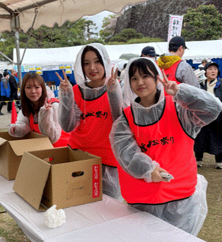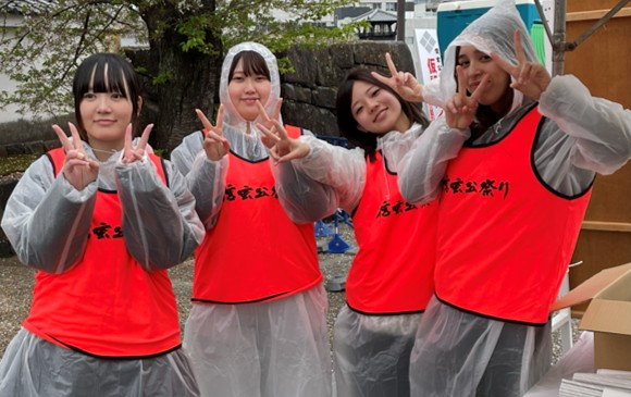 当日はあいにくの小雨模様でしたが、学生は笑顔で有料観覧席の受付と席への誘導を担当しました。